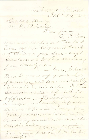 Urbana, IllinoisOcto 24. 1858.His ExcellencyW. H. Bissell.Dear Sir–