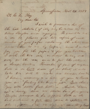 Springfield, Novr 20, 1858Dr C. H. Ray.My dear SirI wish to preserve a Set of the late debates (if they may be called so) between Douglas and myself–2 To enable me to do so, please get two copies of each number of your paper containing the whole, and send them to me by Express;3 and I will pay you for the papers & for your trouble–4 I wish the two sets, in order to lay one away in the raw, and to put the other in