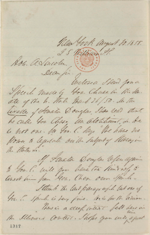 Enclosed I send you a Speech made by Gov. Chase in the Senate of the U. State March 26/50[1850].2 In the tirades of Senator Douglas, I had read that he calls Gov[Governor] Chase an abolitionist, &c.[etc.] He is not one, for Gov. C. says "We have no power to legislate on the subject of Slavery in the States &c–"3