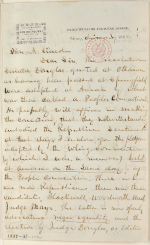 letter to Lincoln is shown in the fifth image. Copies of the Daily Chicago Journal are not known to be extant for September 1854, but the paper most likely initially