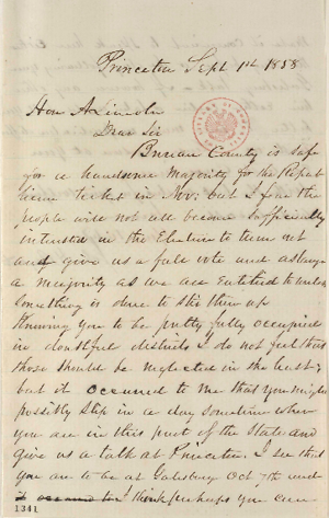 Princeton Sept 1st 1858Hon A LincolnDear SirBureau County is safe for a handsome majority for the Republican ticket in Nov[November]: but I fear the people will not all become sufficiently interested in the election