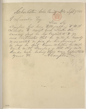 Charleston Coles County IllsSept 7 1858A Lincoln Esqr[Esquire]Dear Sir