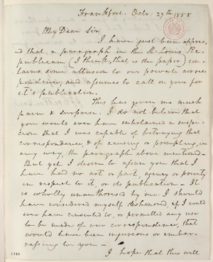 Frankfort– Octr: 27th 1858.My Dear Sir,I have just been apprised that a paragraph in the St: Louis Republican (I think, that is the paper) contains some allusion to our private correspondence, and assumes to call on your for it's publication.2