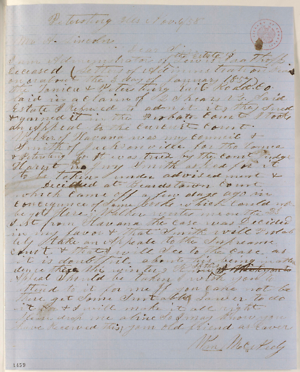 Petersburg Ills Nov. 6/58Mr A. LincolnDear SirI am Administrator of ^the Estate of^ Lewis Saathoff Deceased (Letters of Administration Read on or about the 3 day of January 1857) The Tonica & Petersburg Rail Road. Co laid in a claim of 2 Shears[Shares] Vs. Said Estate.2 I Refused to admit it, they Sued & gained it in the Probate Court I took an Appeal to the curcuit court. Walker of Havana was my council & Smith of Jacksonville for the Tonica & Petersburg Co. It was tried by the court Judge Harret no Jury Smith asked for it to be taken under advisedment & Decided at Beardstown court which came off a few days ago in concurrance of Some Books which could not be got Here; Walker writes me on the 23 Inst from Havana the case was Decided in my favor & that Smith will Probably take an