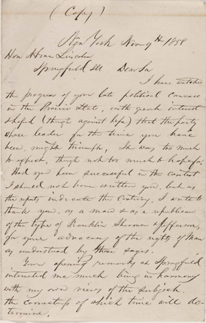 New York Nov 9th 1858Hon Abram LincolnSpringfield IllDear SirI have watched the progress of your late political canvass in the Prairie State, with great interest & hoped (though against hope) that the party whose leader for the time you have been, might triumph. It was too much to expect,