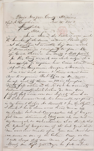 Paris Edgar County. IllinoisNov. 15. 1858.Honl[Honorable] A. LincolnSpringfieldIlls.Sir–