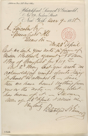 Blatchford, Seward, & Griswold asked Lincoln to collect debt, Martha L. Benner and Cullom Davis et al., eds., The Law Practice of Abraham Lincoln: Complete Documentary Edition, 2d edition (Springfield: Illinois Historic Preservation Agency, 2009), https://lawpracticeofabrahamlincoln.org/Details.aspx?case=141371.