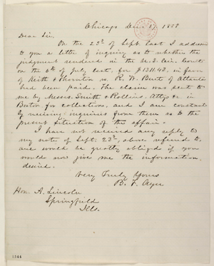 Chicago Dec. 17. 1858Dear Sir,On the 23d of Sept.[September] last I addressed you a letter of inquiry as to whether the judgment rendered in the