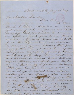 Nashua N. H. Jany 28th 1859Hon Abraham LincolnDear SirThe Hon Frank P Blair addressed our citizens last evening & he in forms us that Douglass had consented to canvas our State, in part, prior to our March election–2 If such turns out to be the fact the Republicans are desirous of securing your services, that you may follow him, & meet him if necessary,