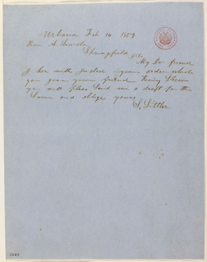 Urbana Feb 16 1859Hon A. LincolnSpringfieldIll.My Dr[Dear] friendI her with Inclose your order which you gave your friend Henry Shew2 you will pleas Send me a draft for the Same and oblige yours3