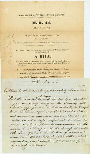 “That the Secretary ^of the Treasury^ be, and he here by is, directed to pay out of any money in the Treasury not otherwise appropriated to Thomas Scott, late register of the Land Office, at Chillicothee, Ohio, such amount as may be a reasonable compensation for extra labor performed by him by persons employed ^by^ him in consequence of the transfer to said office of the business of certain other Land Offices, under the Act1 of approved June 12th 1840: Provided: Theat the whole amount so paid shall not exceed five hundred dollars.”⋄