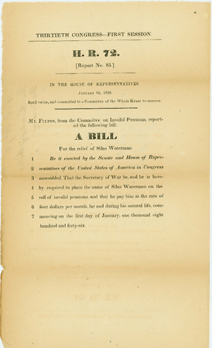 Be it enacted by the Senate and House of Repre- sentatives of the United States of America in Congress assembled, That the Secretary of War be, and he is here- by, required to place the name of Silas Waterman on the roll of invalid pensions, and that he pay him at the rate of four dollars per month, for and during his natural life, com- mencing on the first day of January, one thousand eight hundred and forty-six. |