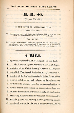 Be it enacted by the Senate and House of Repre- sentatives of the United States of America in Congress assembled, That to each institution or asylum for the in- struction of the deaf and dumb in the United States, which is incorporated by law, and endowed by the legislature of the State with a sum not less than ten thousand dollars, or with an annual appropriation or appropriations from one or more States for the instruction of indigent deaf mutes, amounting to not less than two thousand dollars annually, there be granted one township of land, (excepting section numbered sixteen, for the use of schools therein,) to be |