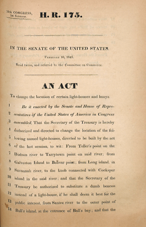 Be it enacted by the Senate and House of Repre- sentatives of the United States of America in Congress assembled, That the Secretary of the Treasury is hereby authorized and directed to change the location of the fol- lowing named light-houses, directed to be built by the act of the last session, to wit: From Teller’s point on the Hudson river to Tarrytown point on said river; from Galveston Island to Bolivar point; from Long island, in Savannah river, to the knob connected with Cockspur island in the said river; and that the Secretary of the Treasury be authorized to substitute a dumb beacon instead of a light-house, if he shall deem it best for the public interest, from Santee river to the outer point of Bull’s island, at the entrance of Bull’s bay; and that the |