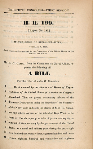 Be it enacted by the Senate and House of Repre- sentatives of the United States of America in Congress assembled, That the proper accounting officers of the Treasury Department, under the direction of the Secretary of the Navy, audit and settle the claims of John W. Simon- ton and others, owners of the island of Key West, in the State of Florida, upon principles of justice and equity, on account of its occupancy by the government of the United States, as a naval and military post, during the years eigh- teen hundred and twenty-three, eighteen hundred and twen- ty-four, eighteen hundred and twenty-five, and eighteen |