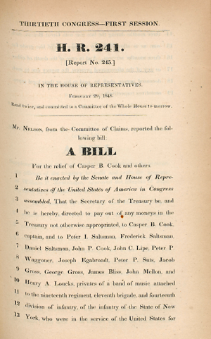 Be it enacted by the Senate and House of Repre- sentatives of the United States of America in Congress assembled, That the Secretary of the Treasury be, and he is hereby, directed to pay out of any moneys in the Treasury not otherwise appropriated, to Casper B. Cook, captain, and to Peter I. Saltsman, Frederick Saltsman, Daniel Saltsman, John P. Cook, John C. Lipe, Peter P. Waggoner, Joseph Egabroadt, Peter P. Suts, Jacob Gross, George Gross, James Bliss, John Mellon, and Henry A. Loucks, privates of a band of music attached to the nineteenth regiment, eleventh brigade, and fourteenth division of the infantry, of the infantry of the State of New York, who were in the service of the United States for |