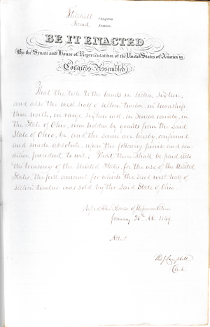 To confirm the title to section six[?] and the west half of section twelve [?] township three north, range si[?]teen east, in Seneca county Oh[?]