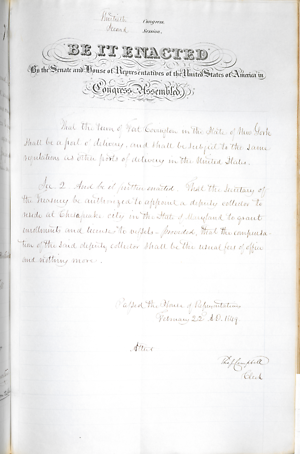 An Act Declaring Fort Covington in the State of New York to be a port of delivery, and for other purposes.