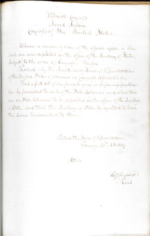 in the office of the Secretary of State, Subject to the order of Congress, therefore