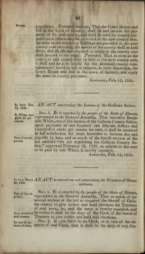 Printed Document, 2 page(s), Laws of the State of Illinois, Passed by the Ninth General Assembly, at their First Session (Vandalia, IL: