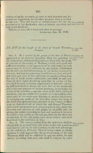 Printed Document, 2 page(s), Laws of the State of Illinois, Passed by the Ninth General Assembly, at their Second Session (Vandalia, IL: J. Y. Sawyer, 1836), 245-46, GA Session: 9-1,