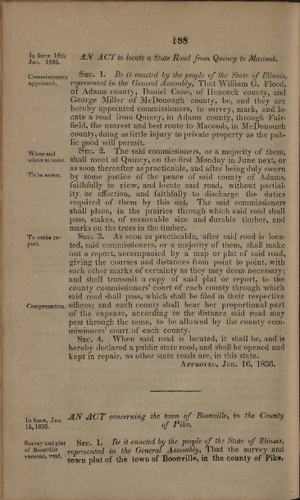 1Responding to a petition from a citizen of Pike County, William Ross introduced HB 53 in the House of Representatives on December 22, 1835. The House passed the bill unamended on December 30. The Senate passed the bill unamended on January 13, 1836. On January 15, the Council of Revision approved the bill and the act became law.