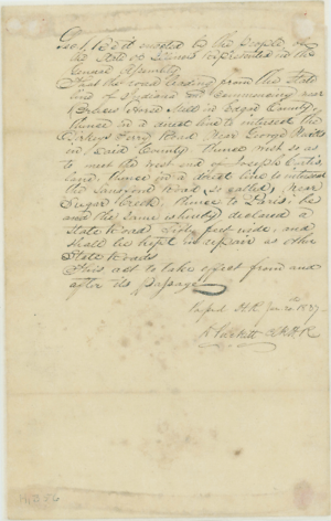 That the road leading from the State line of Indiana and commencing near Bruce[’]s Horse Mill in Edgar County, thence in a direct line to intersect the Dirkeys Ferry Road Near George Nevill[’]s in said County, thence west so as to meet the west end of Joseph Curtis, lane, thence in a direct line to intersect the Sanaford Road, so called, near Sugar Creek, thence to Paris, be and the same is hereby declared a State Road fifty feet wide, and shall be kept in repair as other State Roads