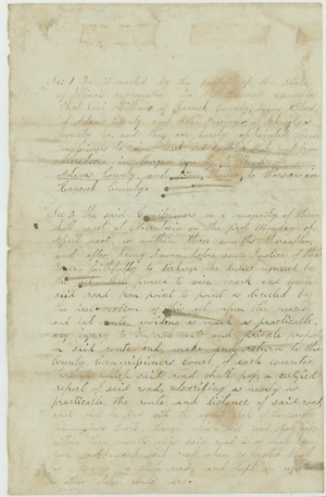 Sec[Section] 1 Be it enacted by the people of the State of Illinois represented in the General Assembly That Levi Williams of Hancock County, James Willard of Adams County[,] and Allen Persinger of Schuyler County be, and they are hereby appointed, Commissioners to view, mark, and locate, a State