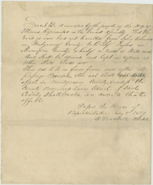 1On January 30, 1837, John Harris in the House of Representatives presented the petition of citizens of Macoupin County, requesting construction of a state road. The House referred the petition to the