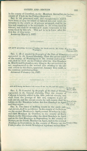 Printed Document, 3 page(s), Laws of the State of Illinois, Passed by the Tenth General Assembly (Vandalia, IL: William Walters, 1837), 111-13, GA Session: 10-1