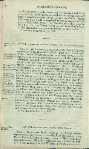 Printed Document, 6 page(s), Incorporation Laws of the State of Illinois, Passed at a Session of the General Assembly (Vandalia, IL: William Walters, 1837), 6-11, GA Session: 10-1