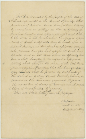 Sec[Section] 1. Be it enacted by the people of the state of Illinois represented in the General Assembly; That purchasers of school, or canal lands, or town lots may by endorsement in writing