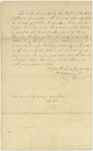 day, to be paid to him for the time actually occupied in the service of the State, under its authority, as Engineer in Surveying, and delineating the Canal route from Lake Michigan to the Illinois River in the years 1823 and 1824.