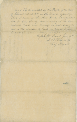 Sec[Section] 1 Be it enacted by the People of the State of Illinois represented in the General Assembly; That so much of the state Road heretofore laid out in Coles county, commencing at the Cumberland Road near Greenup in said county to run in the direction to Paris in Edgar county be and the same is hereby vacated.