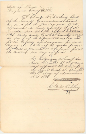 I Charles R Matheny Clerk of the County Commissioners Court in and for the county and state aforesaid do hereby certify that A. Lincoln was at the August Election 1836 duly and Constitutionally Elected as one of the Representatives