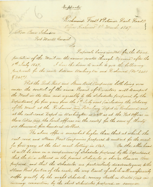 Richmond Fredk & Potomac Rail RoadOffice Richmond 8th March 1847 Hon Cave Johnson Post Master General Sir