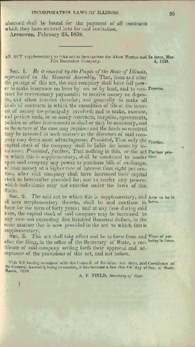 Printed Document, 1 page(s), Incorporation Laws of the State of Illinois, Passed by the Eleventh General Assembly (Vandalia, IL: William Walters, 1839), 95, GA Session: 11-1,