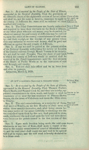 Printed Document, 2 page(s), Laws of the State of Illinois, Passed by the Eleventh General Assembly (Vandalia, IL: William Walters, 1839), 253-54, GA Session: 11-1,