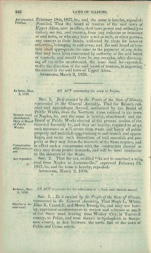 Printed Document, 2 page(s), Laws of the State of Illinois, Passed by the Eleventh General Assembly (Vandalia, IL: William Walters, 1839), 246-47, GA Session: 11-1,