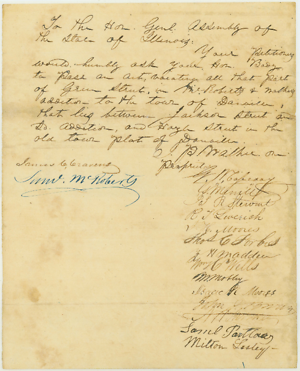 Your Petitioners would humbly ask your, Hon. Body to pass an act, vacating all that part of Green Street, in McRobert’s & Walker’s addition to the town of Danville, that lies between Jackson street and sd.[said] addition, and [Hazle?] street in the old town plot of Danville