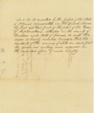Sec [Section]1 Be it enacted by the people of the State of Illinois, Represented in the General Assembly, That all that part of the plat of the town of Shepherdstown, situated in the county of Vermilion and State of Illinois, be, and the same is hereby vacated: Provided, that the consent of the owners of Lots in said plat be given in writing and recorded