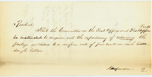 ^Roads^ be instructed to enquire into the expediency of reducing the postage on Letters to a uniform rate of five cents on each letter.