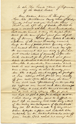 Your Petitioner William R Thompson of Ann Arbor Washtenaw County & State of Michigan humbly shows unto your honorable bodies That on the 27th day of October AD 1835 he made a contract with Hon Amos Kendall then Postmaster General to carry the United States mail for the term of four years from the first day of