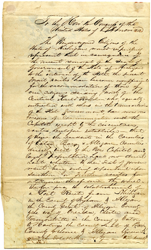 pray the establishment of a Post Route from [?]Michigan in the County of Ingham to Allegan the County seat of Allegan County by