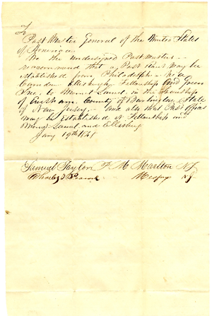 We the undersigned Post Masters, reccommend that a Post Rout may be established from Philadelphia via Camden Ellisburgh Fellowship