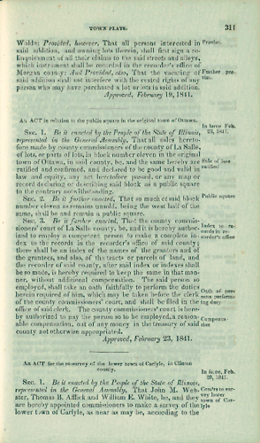 Printed Document, 2 page(s), Laws of the State of Illinois, Passed by the Twelfth General Assembly (Springfield, IL: William Walters, 1841), 311-12, GA Session 12-2,