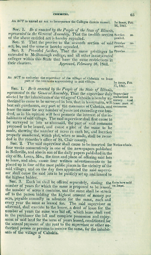 1On January 25, 1841, Adam W. Snyder in the Senate presented the petition of inhabitants of Cahkoia, requesting the passage of a law authorizing them to lease part of the village commons