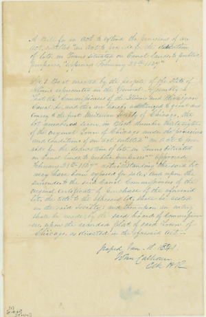 Sec[Section] 1 Be it enacted by the people of the state of Illinois represented in the General Assembly. That the Commissioners of the Illinois and Michigan Canal, be, and they are hereby authorized to grant and convey to the first Unitarian Society of Chicago, the lot numbered seven, in Block number thirty eight, of the original Town of Chicago under the provisions and conditions of an act entitled “an act to provide for the