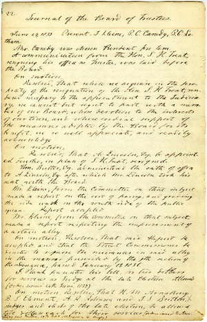 Resolved, That A. Lincoln, Esq.[Esquire] be appointed Trustee, in place of S. H. Treat, resigned.