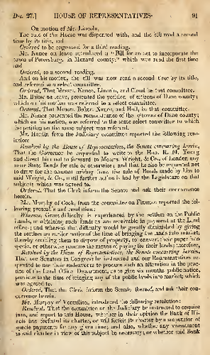 Printed Transcription, 1 page(s), Journal of the House of Representatives, of the Eleventh General Assembly of the State of Illinois, at Their Called Session (Springfield, IL: William Walters, 1839), 91